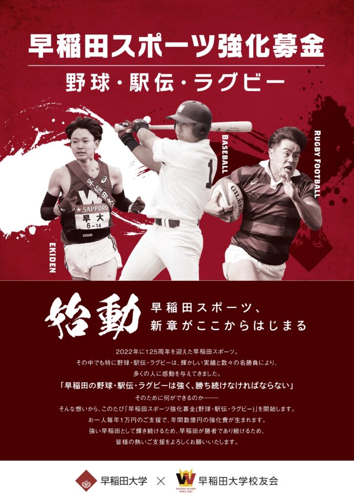 野球、ラグビー、駅伝の早稲田3大スポーツに限定した募金が始まりました。